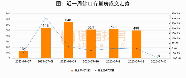 从存量房来看,2025年07月13日佛山存量房单日成交8套,比昨日减少490套,环比下降98.4%。从近一周存量房成交来看,佛山存量房日均成交套数为410套,07月13日单日成交8套,低于近一周平均水平98%。