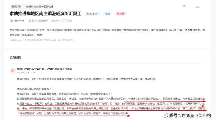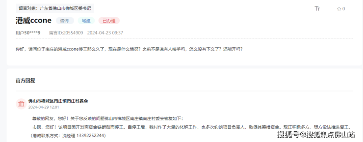 南庄村委会回复:该项目因开发商资金链断裂而停工。自停工后,我村作了大量的化解工作,也多次约谈项目负责人,敦促其筹措资金。现正积极多方、想方设法推进复工。