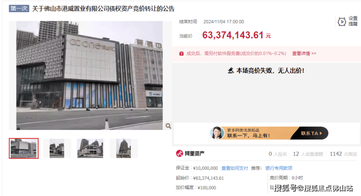 小编从阿里法拍获悉,11月4日,关于佛山市港威置业有限公司债权资产竞价转让 ,因无人出价直接竞价失败。