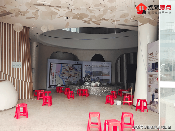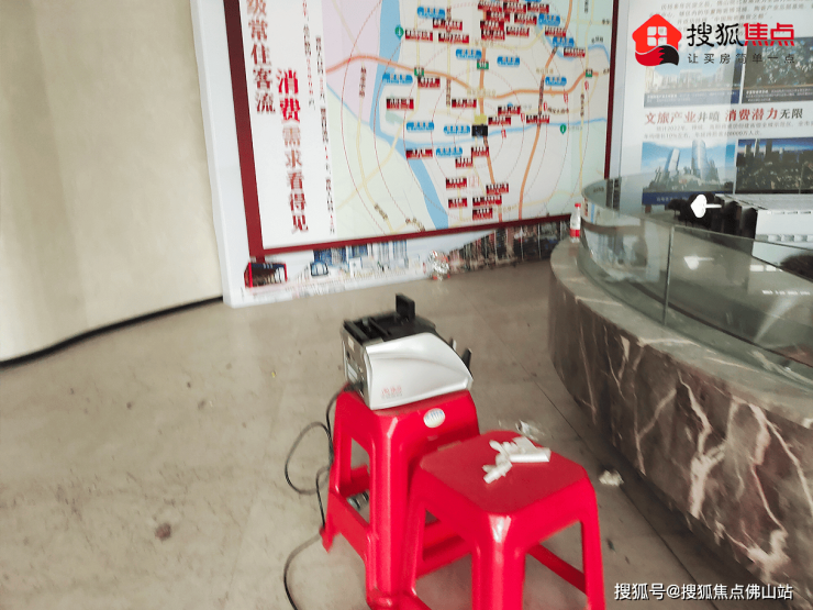 售楼部大门敞开,但里面漆黑一团,空无一人,现场摆满了红色胶凳 ,小狐已经脑补这里唇枪舌战的场面。