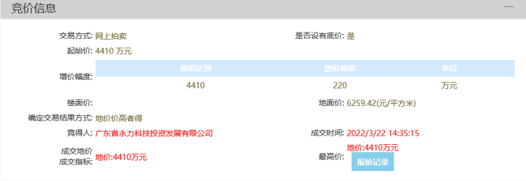 3月22日,广东省永力科技投资发展有限公司以底价4410万竞得三水新城占地7045.38㎡的迷你商服地,折合成交楼面价为2503.8元/㎡。