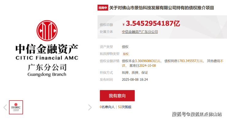 近日,京东资产交易平台显示,中国中信金融资产管理股份有限公司广东省分公司处置对佛山市景怡科技发展有限公司持有的债权。据了解,债权本金为3.36亿,债权利息达1783.34万,基准日为2024年10月8日。抵质…