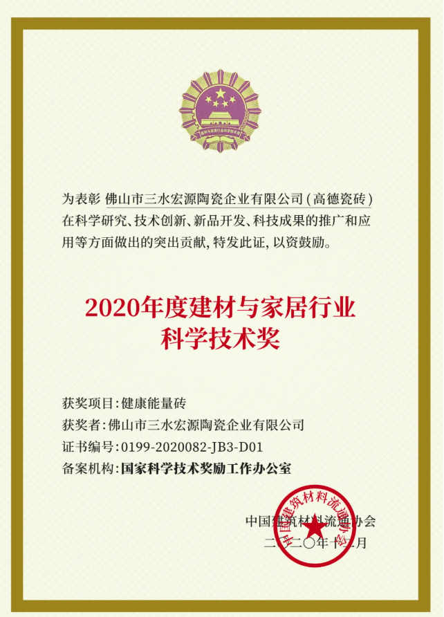 “产品常新,企业长青”,这是企业界的一句格言。2018年,在梁董带领之下,历经三年研发的“高德·健康能量砖”研发成功,强势推出市场,开创行业功能性瓷砖新品类。产品经国家权威检测机构检测,拥有释放远红外线、释放负氧离子功能,及抗菌,降解甲醛的功能。健康能量砖系列产品先后获得了德国莱茵抗菌认证、“HiH健康标识”认证、2020建材与家居行业科学技术奖、中卫安“抗菌”“净化甲醛”双认证,以及多项产品专利,成果尤为显著。