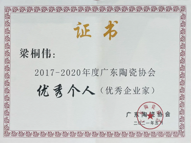 7月20日,2021年广东省陶瓷行业年会暨广东陶瓷协会第七届会员大会成功举办,会上表彰了一批优秀陶瓷企业及企业家。其中,高德瓷砖所属企业宏源陶瓷集团董事长梁桐伟先生从企业成立至今,带领员工一如既往地坚持健康理念,实施健康战略,对行业功能型瓷砖的发展和产品创新研发,新品类创立与发展,成就先进;坚持产品创新研发,多个产品引领市场趋势;荣获2017-2020年度广东陶瓷行业“优秀企业家”称号。