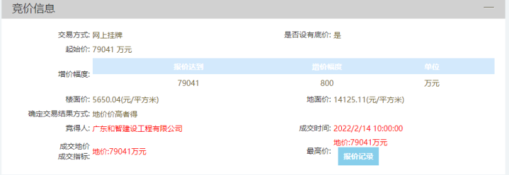 2月14日10时,顺德北滘镇和祐医院东侧一宗商住地正式进行网拍,最终,美的以底价79041万元拿下,折合楼面单价5650.04元/㎡。