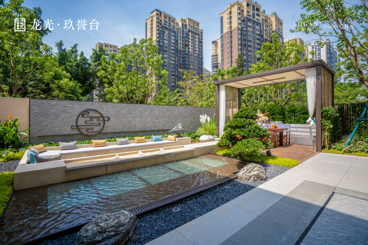 此次开放的园林示范区沿袭龙光玖系集合新中式建筑精粹,以岭南四大名园之一“梁园”立意,采用岭南特有的组景手法,提取梁园中特有景色作为亮点,将梁园十二石斋、群星草堂、汾江草庐、寒香馆四组园林群以起、转、承、合的演绎手法,使用“平庭”、“山庭”、“水庭”、“石庭”为组景手段,结合厅、堂、院主要空间,进行串联,打造的多重归家礼遇。满足业主全生命周期观赏和功能需求,为业主打造专属的岭南园林生活画卷。