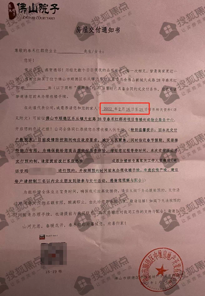 有业主跟小狐爆料,近日终于收到纸质房屋交付通知书,告知二期业主能够在2022年2月16日至28日期间前往售楼处收楼了。
