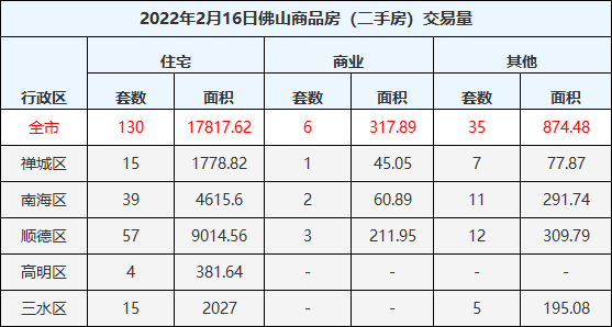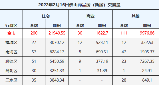 2月16日,佛山一手住宅成交200套,成交面积21940.55㎡