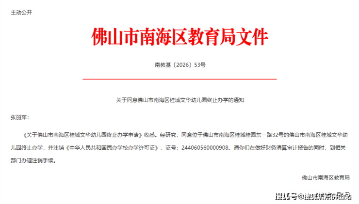 近日,佛山市南海区教育局发布关于同意佛山市南海区桂城文华幼儿园终止办学的通知。
