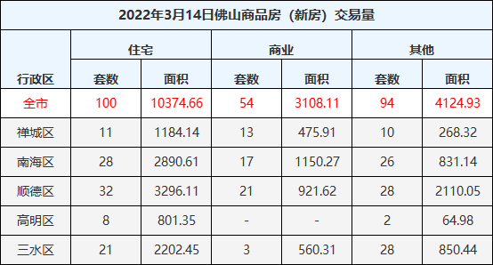 3月14日佛山五区一手房网签100套,二手房网签72套