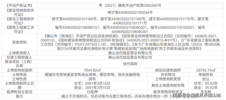 拍卖信息显示,该项目位于广东省佛山市南海区大沥镇黄岐泌冲浔峰洲路地段,土地面积为7844.82㎡,规划总建筑面积合计29793.15㎡,在建建筑物总面积合计为10983.98㎡。