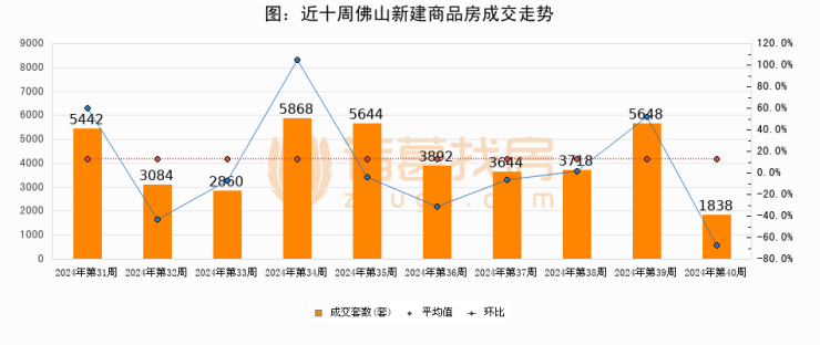 进入2024年第40周(09月30日-10月06日),佛山新建商品房成交1838套,较上周减少3810套,环比下降67.5%