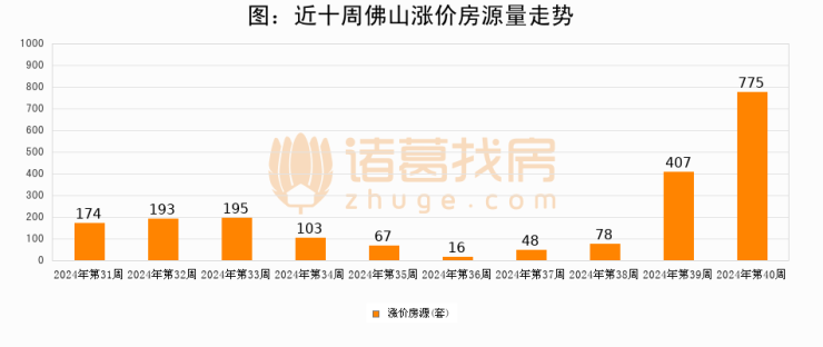从调价房源来看,第40周佛山涨价房源775套,较上周上涨90.4%。与此同时,40周涨价房源占比提升1.17个百分点,业主信心持续恢复。