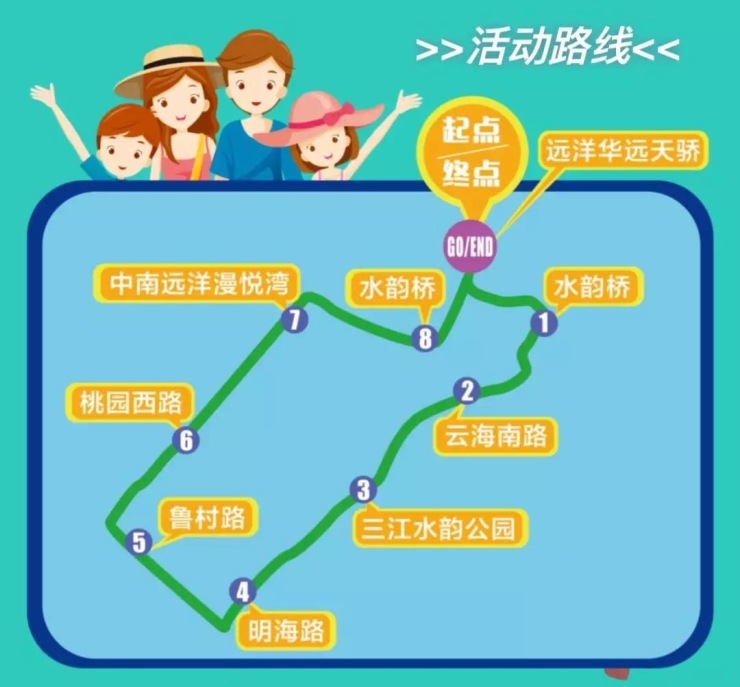 活动以远洋华远·天骄为起终点,途径水韵桥、三江水韵公园、明海路等多个打卡点。据悉,主办方在沿途设置了歌舞表演、公仔人偶互动拍照、抽奖等精彩活动,还有专业手绘师为你进行创意彩绘打造个性造型。