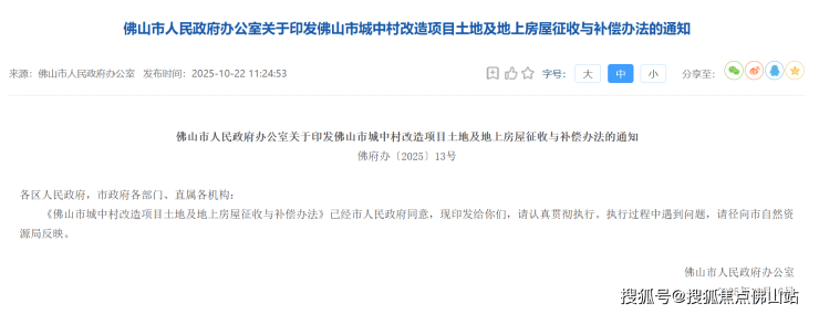 10月22日,佛山市人民政府发布《佛山市城中村改造项目土地及地上房屋征收与补偿办法的通知》,自2025年12月1日起施行。
