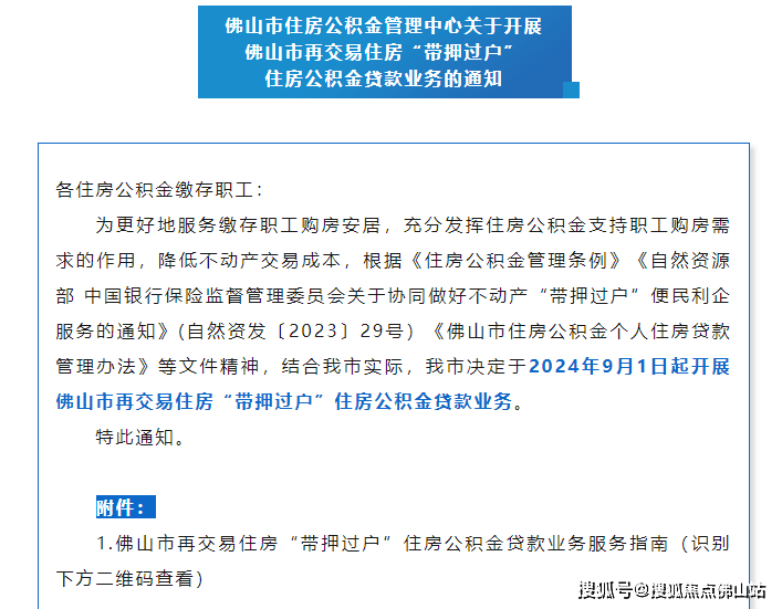 8月22日,佛山市住房公积金管理中心发布关于开展佛山市再交易住房“带押过户” 住房公积金贷款业务的通知。