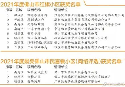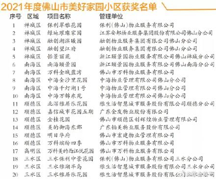 今年1月20日,经过层层选拔,最终全市共有20家物业小区获评“美好家园”、8家获评“红旗小区”、3家获评“佛山市民喜爱小区”。