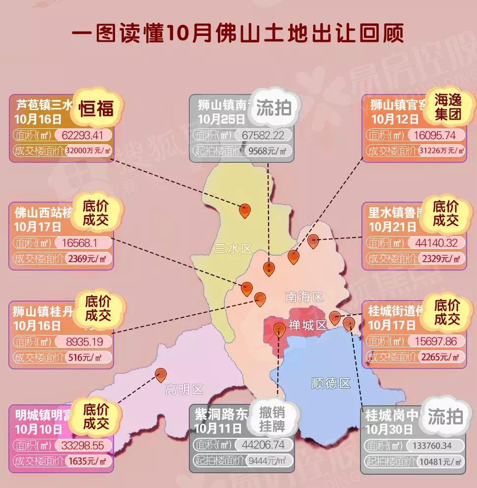 随后官窑狮山宅地、桂城商地、佛山西站核心区商地、里水和顺商地、三水芦苞宅地纷纷以底价成交告终。