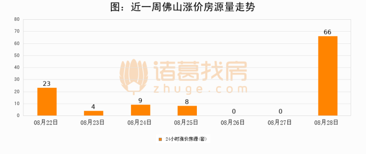 根据诸葛找房数据显示,佛山24小时涨价房源量为66套,较08月27日增加66套,环比上涨0%。与此同时,涨价房源占比小幅扩大,业主信心有所提升。
