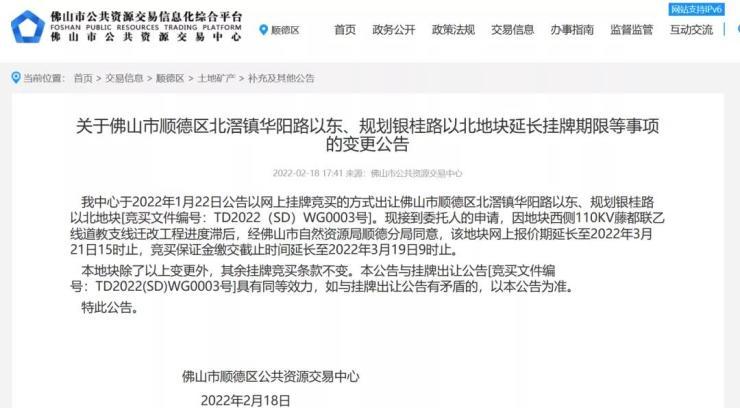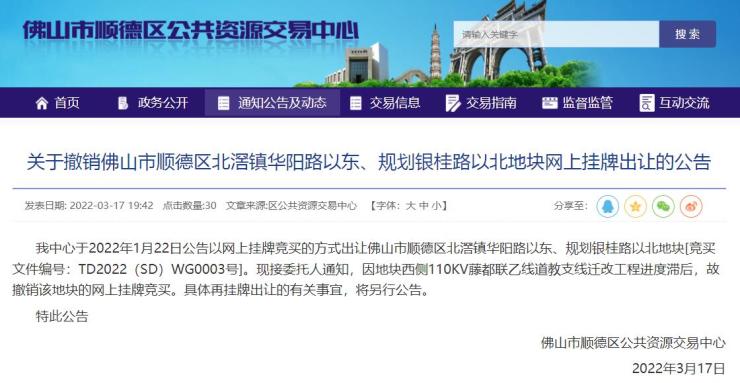 日前,从佛山公共资源交易中心获悉,原计划3月21日网拍的北滘镇华阳路以东、规划银桂路以北地块因地块西侧110KV藤都联乙线道教支线迁改工程进度滞后撤销挂牌。