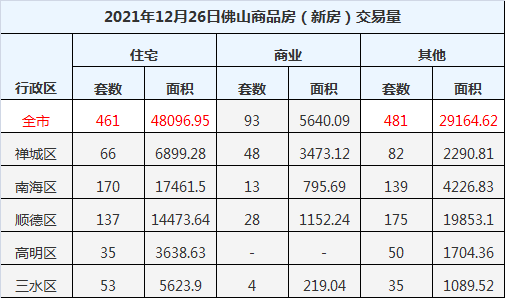 12月26日,佛山一手住宅成交461套,成交面积48096.95㎡