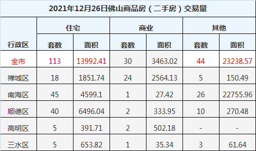 12月26日佛山五区一手房网签461套,二手房网签113套