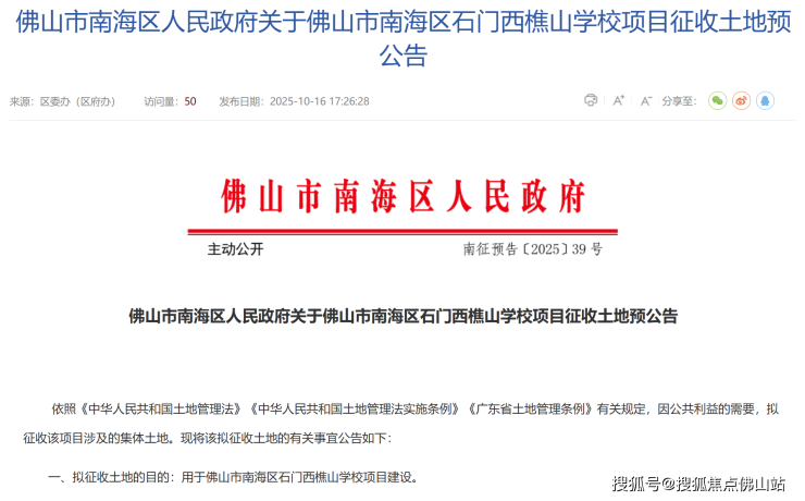 近日,佛山市南海区人民政府发布关于佛山市南海区石门西樵山学校项目征收土地预公告。