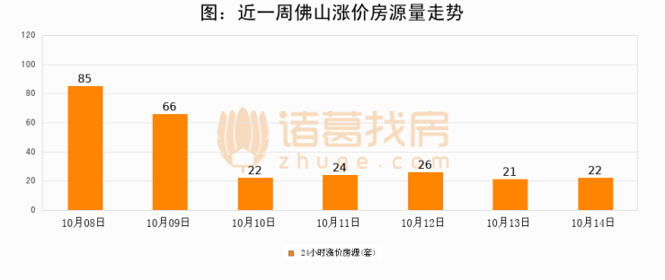 根据诸葛找房数据显示,佛山24小时涨价房源量为22套,较10月13日增加1套,环比上涨4.8%。与此同时,涨价房源占比小幅扩大,业主信心有所提升。
