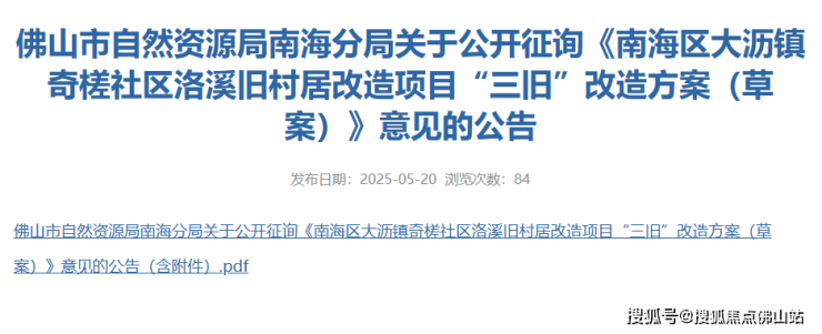 5月20日,佛山市自然资源局南海分局发布关于公开征询《南海区大沥镇奇槎社区洛溪旧村居改造项目“三旧”改造方案(草案)》意见的公告。