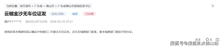 近日,有市民在领导留言板上表示:“南海区里水镇碧桂园云樾金沙收楼后三年都无车位证发。讲无在城建部门备案。要求城建部门督促尽快办证。”
