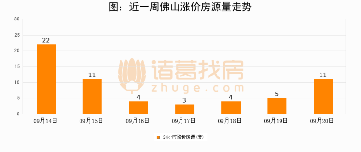 根据诸葛找房数据显示,佛山24小时涨价房源量为11套,较09月19日增加6套,环比上涨120%。与此同时,涨价房源占比小幅扩大,业主信心有所提升。