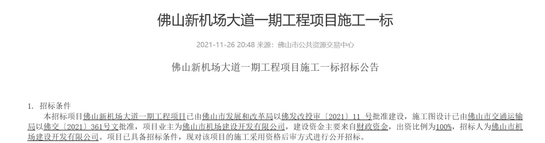 11月26日,佛山市公共资源交易中心公示《佛山新机场大道一期工程项目施工一标招标公告》。公告显示,该项目拟于春节前动工,预计工期24个月。
