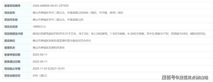 今年4月,广东省投资项目在线审批平台显示,禅城区季华二路以北、华富南路以西地块(即莲塘村酒店、写字楼、商场)项目通过备案。