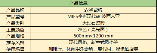安华瓷砖MIES密斯现代砖系列——波西米亚,灵感来源于伊朗进口名贵大理石,真实还原大理石的细腻质感,外表与内在呈现出一致的通透纹理,色泽温润柔和,把灰蓝白多种颜色和谐融合,表现波西米亚浪漫自由之风,与现代风格、新中式风格等搭配都十分合适。而且,波西米亚瓷砖宽600mm,长1200mm,大规格更易拼接,在造型上有更多的可塑性。另外,它的吸水率低,抗压性和耐磨性、抗污性都非常好,可适用于咖啡厅、休闲娱乐会所、度假村、星级酒店等公用空间,有兴趣者可以到实体店了解一下。