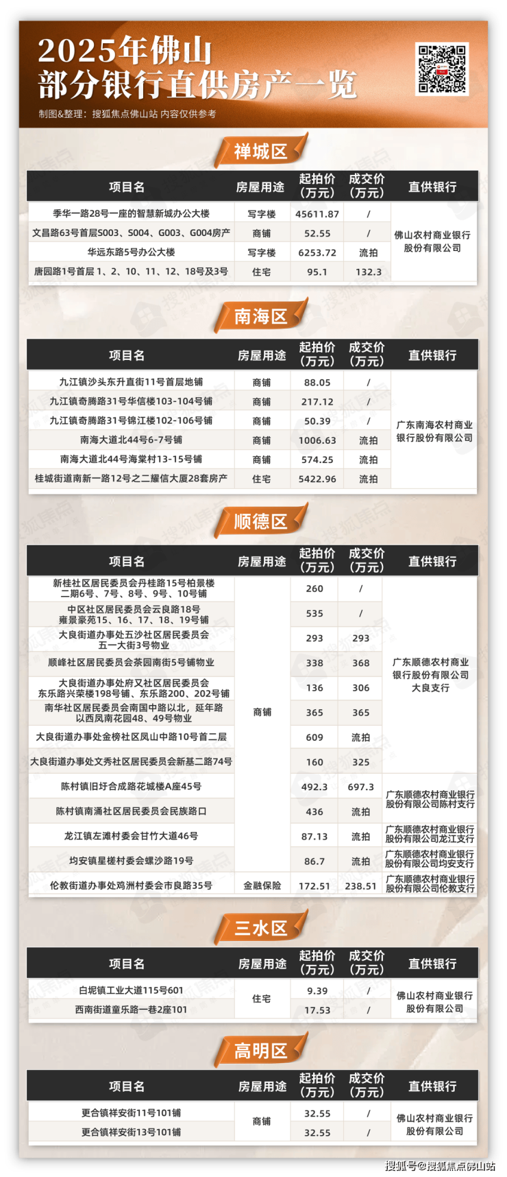 禅城、三水、高明的银行直供房,均由佛山农村商业银行股份有限公司挂牌直售。