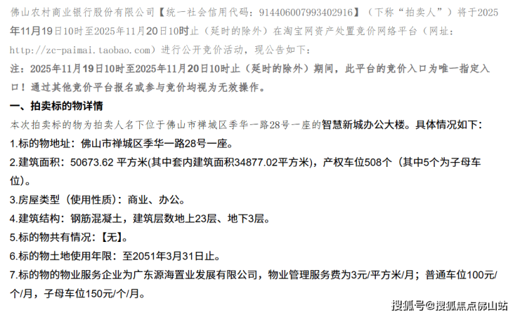 拍卖资料显示,该写字楼建面约5.06万㎡,共有508个产权车位,土地使用年限剩余不到26年,权属人为佛山农村商业银行股份有限公司。