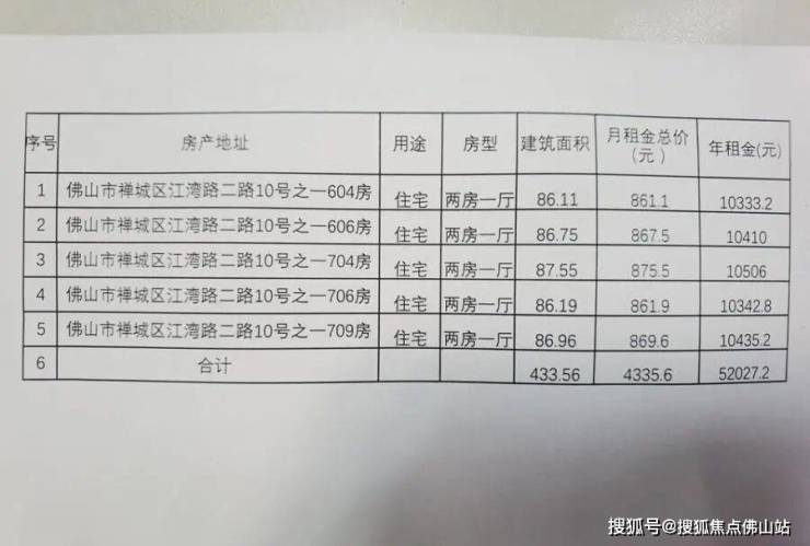 公告显示,这些房屋位于佛山市禅城区江湾二路10号之一,合计建面约433.56㎡,起始价为4335.6元/月,租期为1年。