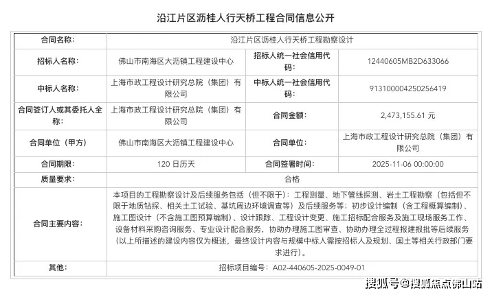 近日,沿江片区沥桂人行天桥工程勘察设计中标结果公示。