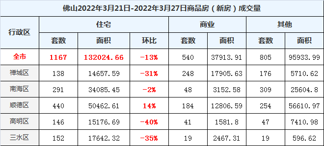 据佛山搜狐焦点统计,上周(2022.3.21-3.27)佛山新房网签数仅有1167套,创3月周成交新低,网签面积13.2万㎡,环比下降13%。
