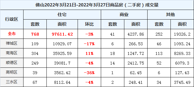 二手房方面,上周佛山二手房网签768套,网签面积9.76万㎡,环比下降了3%。