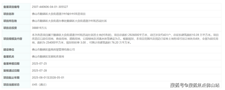 7月28日,广东省投资项目在线审批监管平台显示,佛山市顺德区大良街道逢沙村城中村改造项目通过备案。