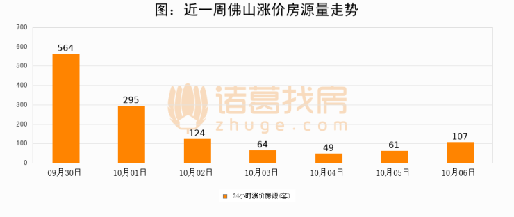 根据诸葛找房数据显示,佛山24小时涨价房源量为107套,较10月05日增加46套,环比上涨75.4%。与此同时,涨价房源占比小幅扩大,业主信心有所提升。
