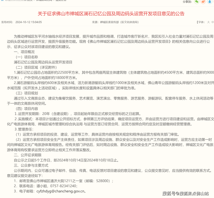 近日,禅城区人民政府门户网发布了有关《征求佛山市禅城区活力新港公园和佛山儿童公园运营开发项目意见的公告》和《征求佛山市禅城区澜石记忆公园及周边码头运营开发项目意见的公告》。