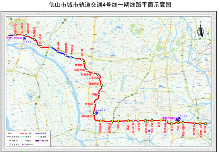根据项目初步设计批复,佛山地铁4号线一期工程西起北江大道站,东至港口路站,线路全长55.22km,其中地下段49.14km,过渡段0.82km,高架段5.26km;全线设33座车站(地下站30座、高架站3座),平均站间距约1.71km;设平胜车辆段和大塱山停车场,三水、绿岛湖、平洲3座主变电站,由湾华控制中心统一调度。