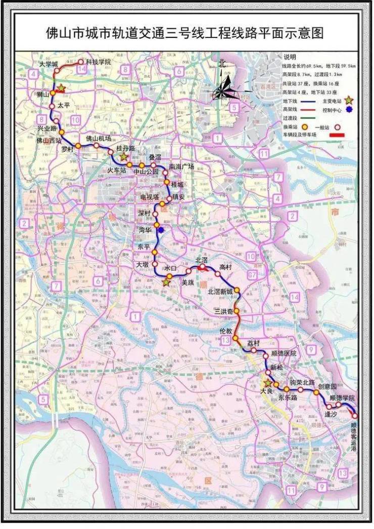 佛山地铁3号线线路全长约为69.5公里,其中3号线首通段(顺德学院-镇安段)共22个车站,设两个停车场(逢沙停车场、北滘停车场),两个主变电站(夏园、岳步),总共长40.72公里,计划2022年底实现试运行。