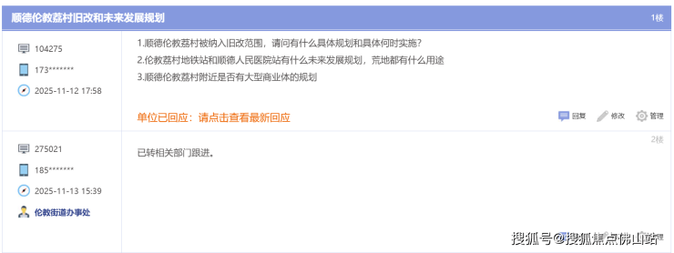 近日,有网友在顺德区政府论坛咨询关于顺德伦教荔村旧改和未来发展规划。他表示:“顺德伦教荔村被纳入旧改范围,请问有什么具体规划和具体何时实施?伦教荔村地铁站和顺德人民医院站有什么未来发展规划,荒地都有什么用途,…