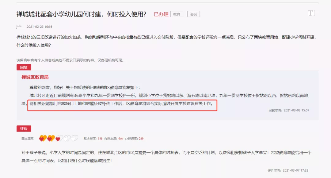 但是根据官方回复可知,待相关职能部门完成项目土地和房屋征收补偿工作后,区教育局将结合实际适时开展学校建设有关工作。