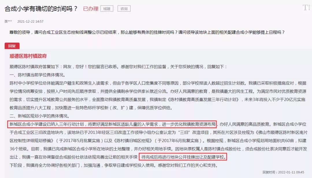 近日,根据官方回复“新城区合成小学建设已纳入三年行动计划,因地块原权属人是陈村镇合成股份社,须合成股份社表决同意后才能开发出让,我镇一直在协调督促合成股份社依法依规完善出让前的相关手续,待完成后将进行地块公开挂牌出让及配建学校。下阶段,我镇将全力协调好各相关部门,加强沟通,争取早日建成学校投入使用。”