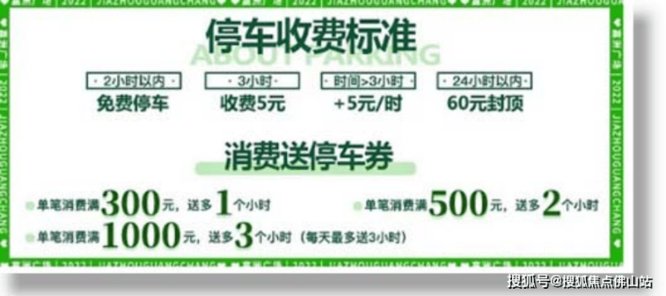 单笔消费满300元免费停1小时,满500元免费停2小时,满1000元免费停3小时。