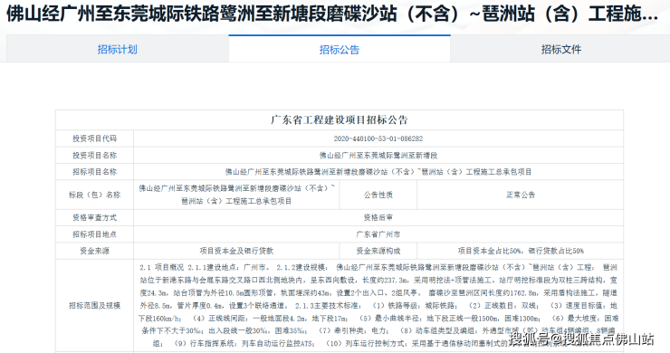 近日,佛山经广州至东莞城际铁路鹭洲至新塘段磨碟沙站(不含)~琶洲站(含)工程施工总承包项目发布招标公告。